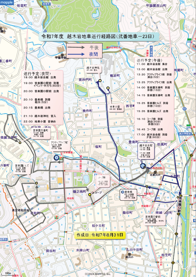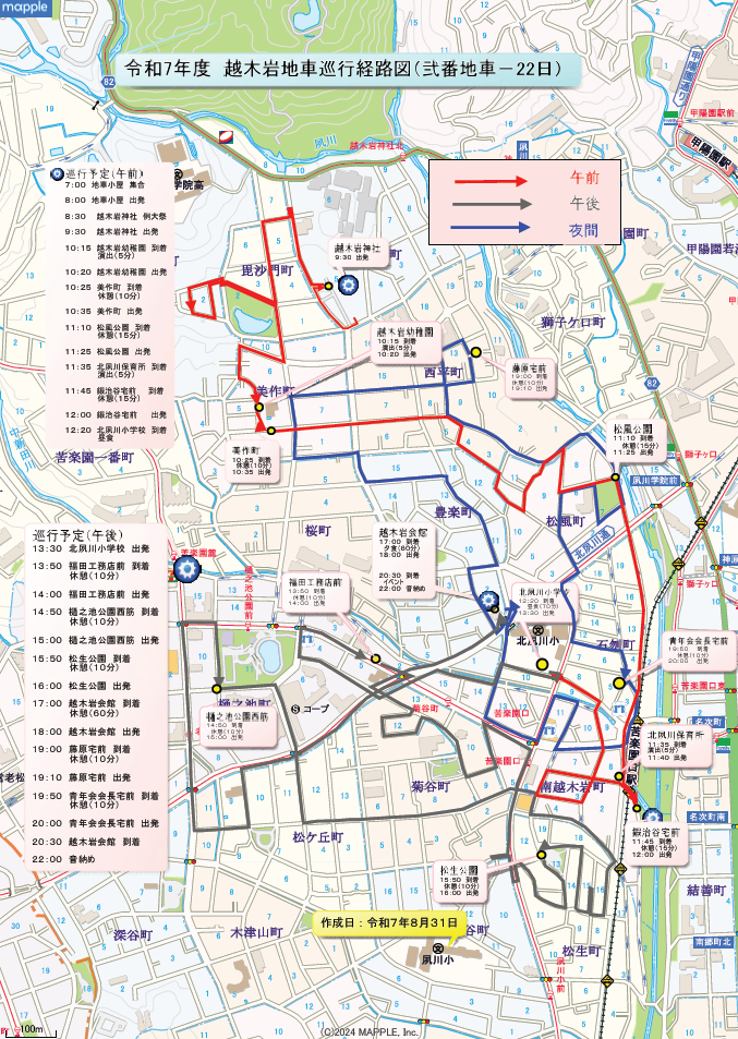 昔は、越木岩地域には、上・中・下新田で計3台のだんじりがありましたが、社会の諸事情により、昭和36年よりだんじり巡行は中止となりました。そして、昭和55年越木岩青年会によって再開され、平成12年にはだんじりを新調し、現在新旧2台で地域を練り歩き、地域の和・活性化に貢献することを目的としています。我々青年会は、新だんじり(弐番だんじり)を曳き、これまで受け継がれてきた伝統や想いを若い世代に継承しています。※事業内で本会により撮影された写真・動画は広告等に使用させていただく場合がございます。あらかじめご了承ください。
